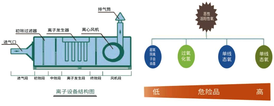 活性氧離子除臭設(shè)備主要包括外殼、初效過濾器、中效過濾器、活性氧離子發(fā)生器、終效過濾器、離心風(fēng)機、控制裝置等組成。