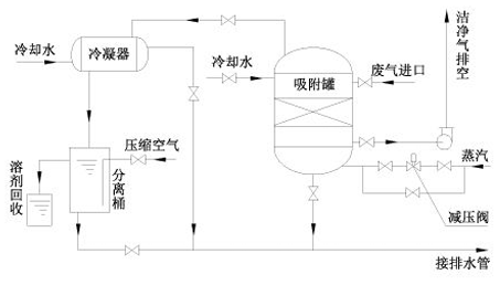 活性炭使用一段時間吸附了一定量的溶劑后,使其再生。再生時用蒸汽自塔底部噴入,把活性炭中的吸附劑的溶劑蒸出。脫附后的有機物進入催化燃燒爐在300-400℃進行催化燃燒將C、H化合物氧化為CO?和H?O等?;蚪涍^冷凝器冷凝液體,進入分離筒,分離回收有機溶劑,殘液進入曝氣筒,經過曝氣后排出。